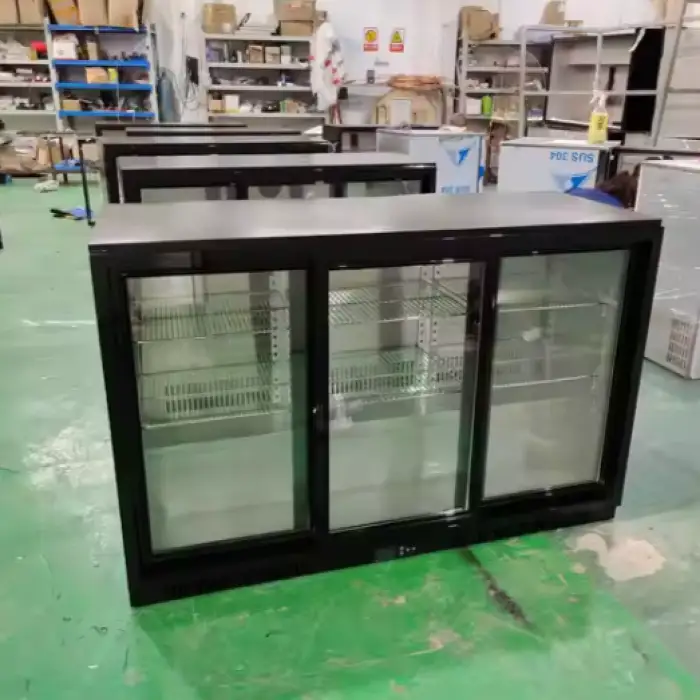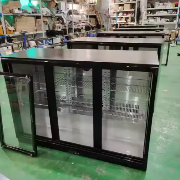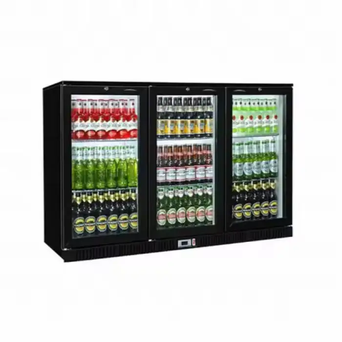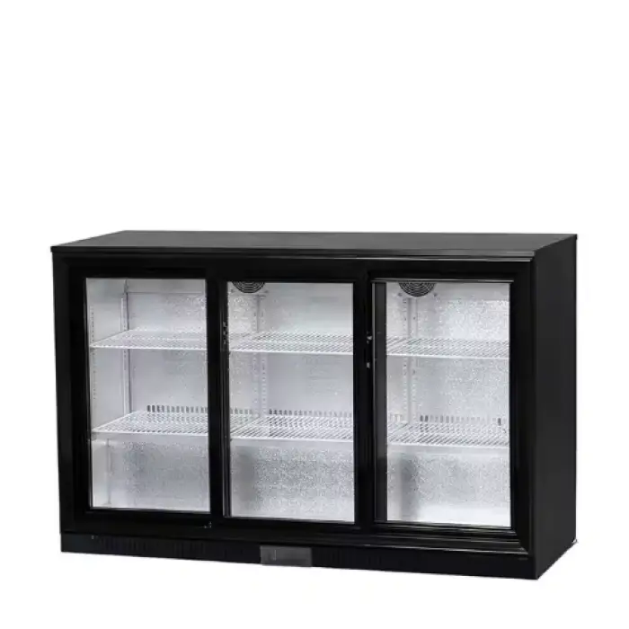 It features three sliding doors for easy access to stored beverages. For details on door glazing (tempered glass vs. solid), handle style or internal lighting, please refer to the product gallery or the seller's specification sheet.