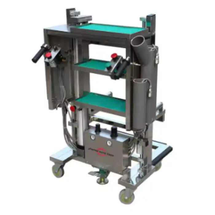 The trolley is powered by a premium pneumatic cylinder, which provides reliable performance for lifting and lowering components.