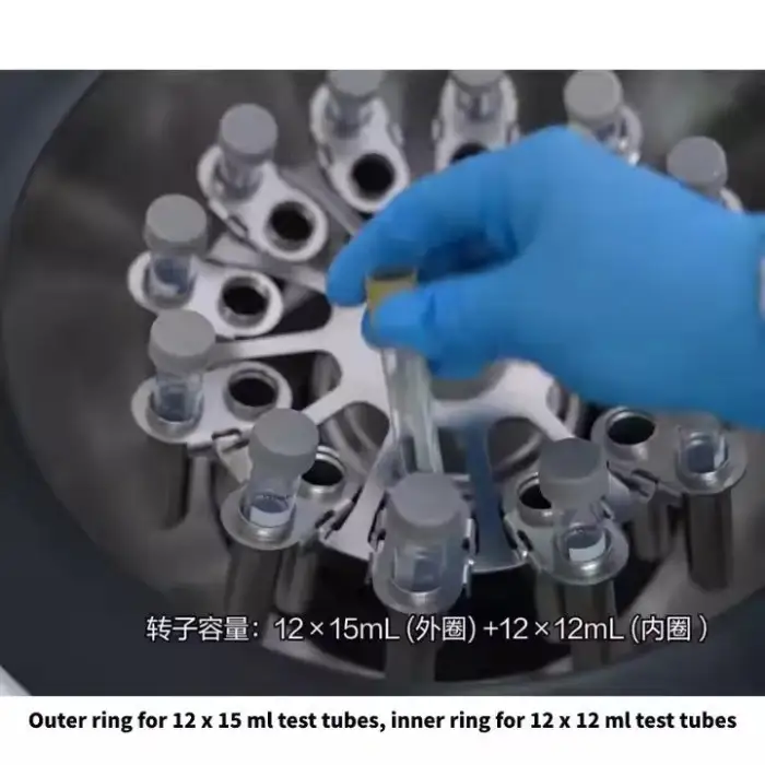 The rotor capacity of the TKLXJ-021 is 12 x 15 mL in the outer ring and 12 x 12 mL in the inner ring.