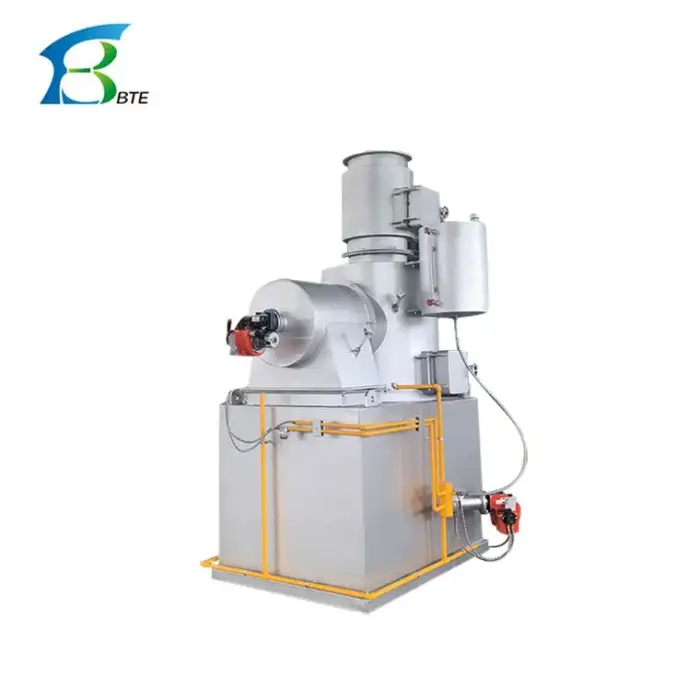 The machine has a burning capacity ranging from 10 to 500 kg per batch, depending on the model.