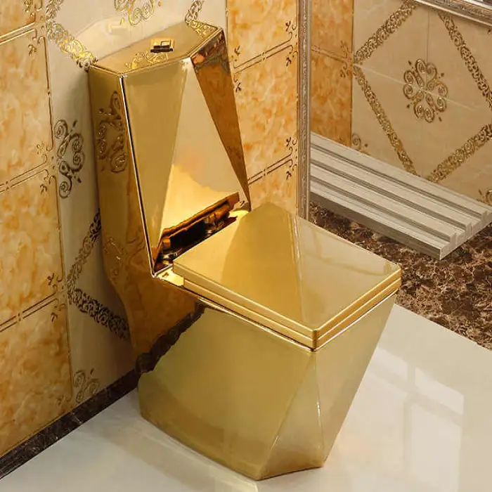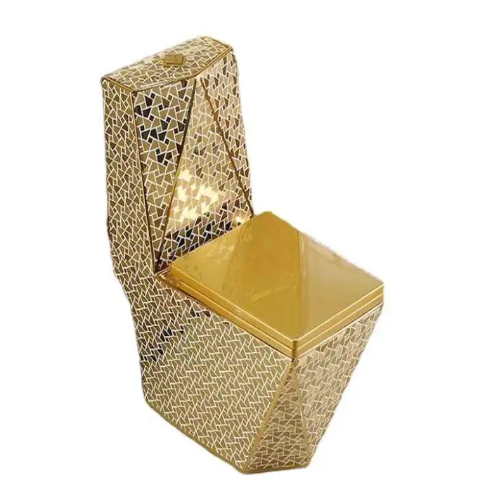 The Toilet with Center Flush Technology is available in a stylish gold ceramic finish, adding a touch of elegance to your bathroom.