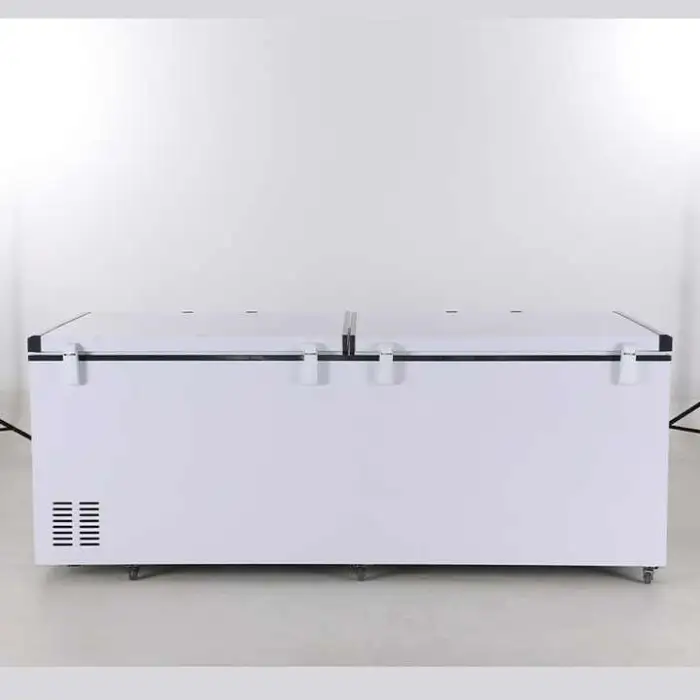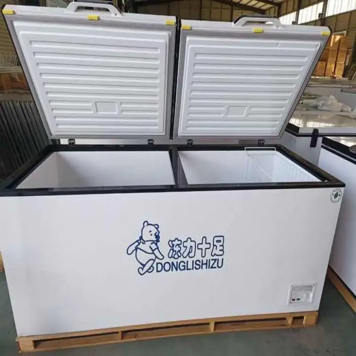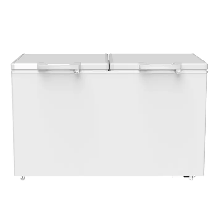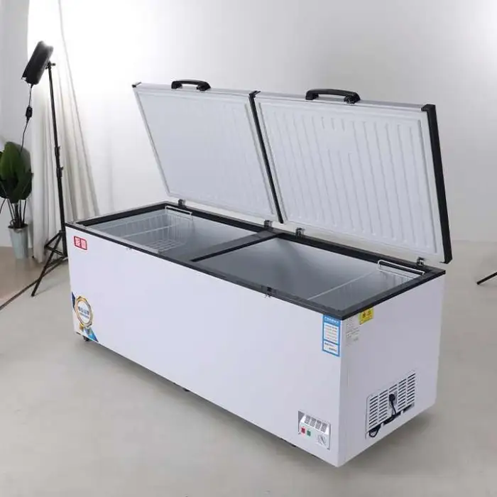 This is a top-open double-door chest freezer (horizontal deep freezer) designed for commercial and home use. It's ideal for storing meat and other frozen foods in supermarkets, restaurants, shops, and households needing extra freezer capacity.