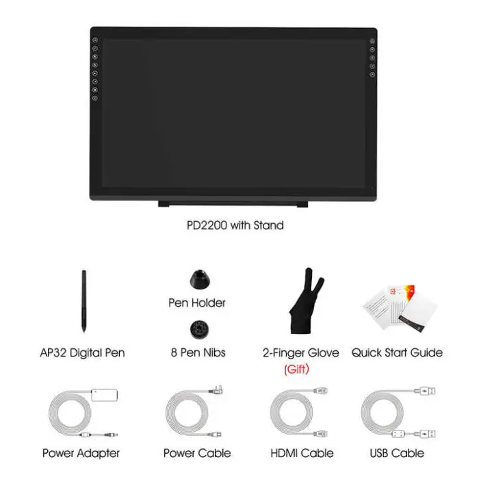 The description does not list included accessories. Typical inclusions may be the digital pen, pen holder, cables (HDMI, USB, power), and a quick-start guide — verify the actual package contents with the seller.