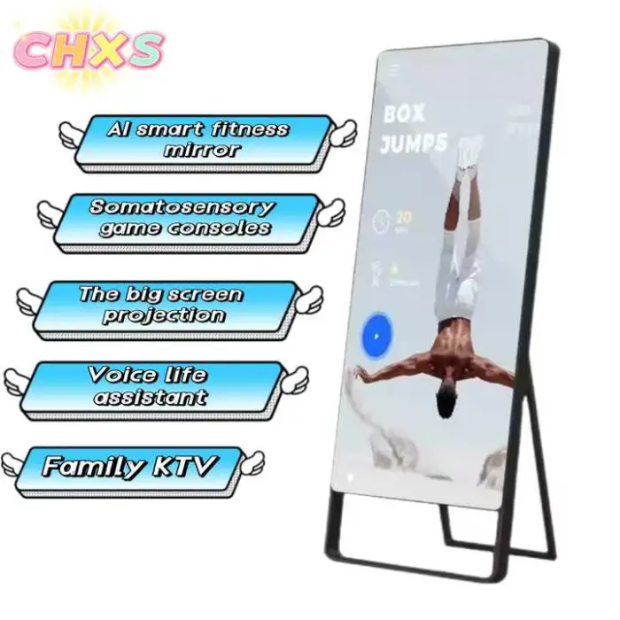 The fitness mirror is available in size options of 21.5 inches, 32 inches, and 43 inches.