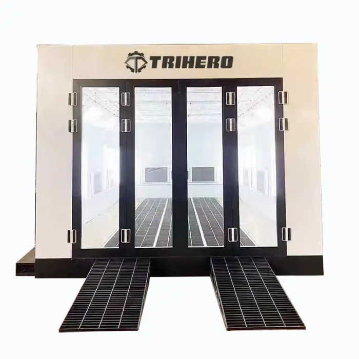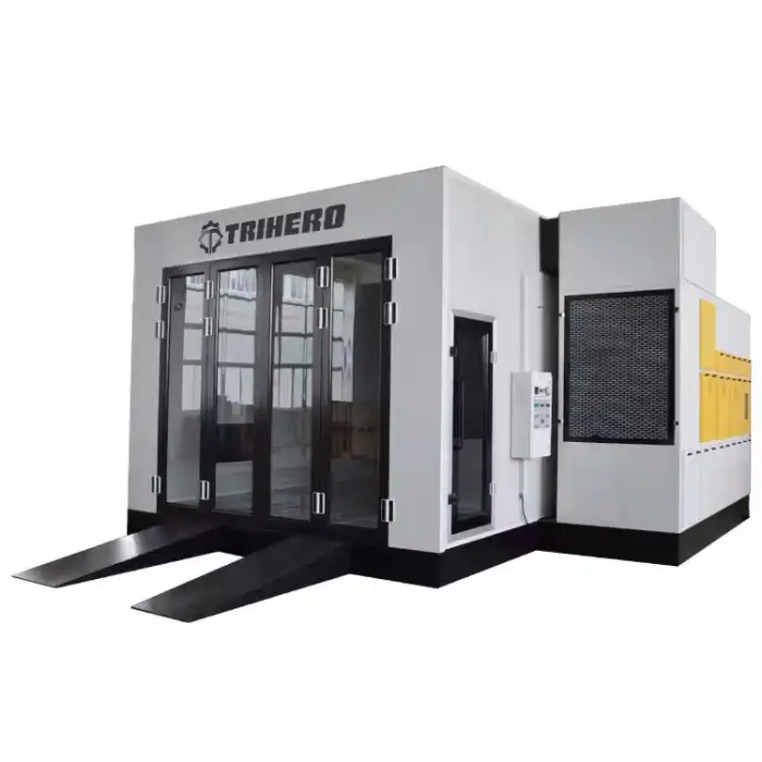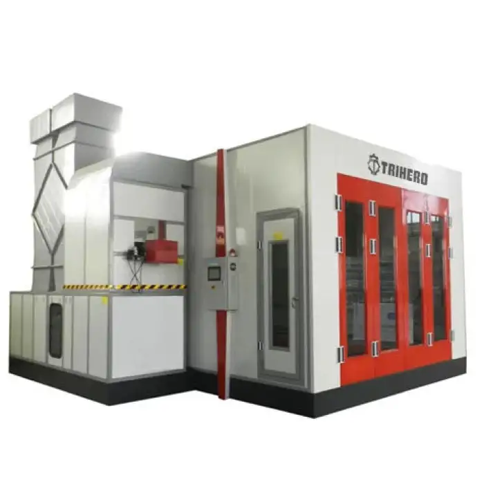 The Trihero spray booth features a three-stage filter system, including a roof filter and a floor filter, to maintain clean air quality.