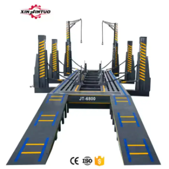 The Truck Frame Machine is designed for repairing truck frames, bus chassis, and other heavy-duty vehicles, making it suitable for automotive repair shops and commercial trucking companies.
