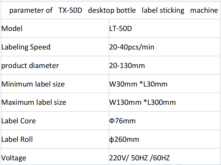 The TX50D Desktop Bottle Label Sticking Machine is designed to apply labels to bottles efficiently and accurately, making it ideal for businesses in the food, beverage, and cosmetics industries.