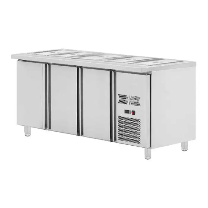 The unit is a refrigerated prep table with a temperature range of 0.5°C to 5°C, suitable for keeping pizza, sandwich and salad ingredients chilled (not frozen).