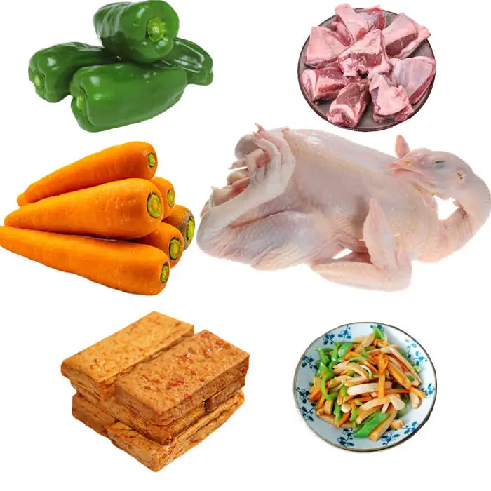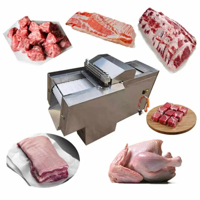 The machine is designed to cut chicken, goat, and beef into uniform cubes.