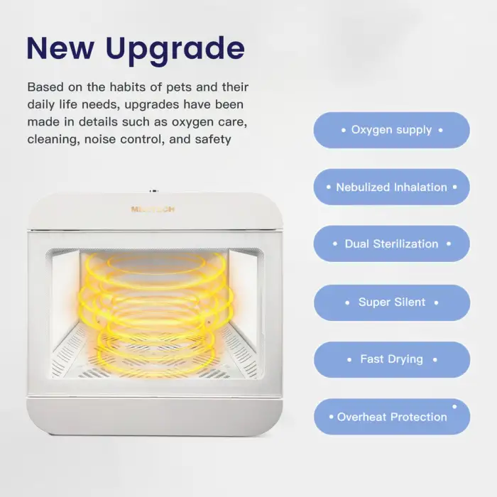 The UV sterilization feature helps to eliminate harmful bacteria and viruses within the oxygen chamber, ensuring a clean and safe environment for your pet during recovery or treatment.
