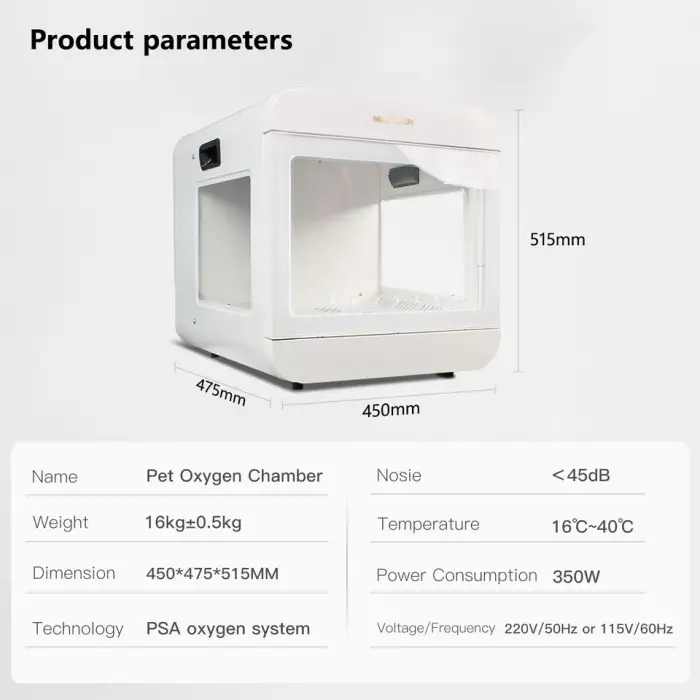 The oxygen chamber can provide a maximum air volume of 10.5 m³/h, ensuring adequate oxygen supply for your pet.