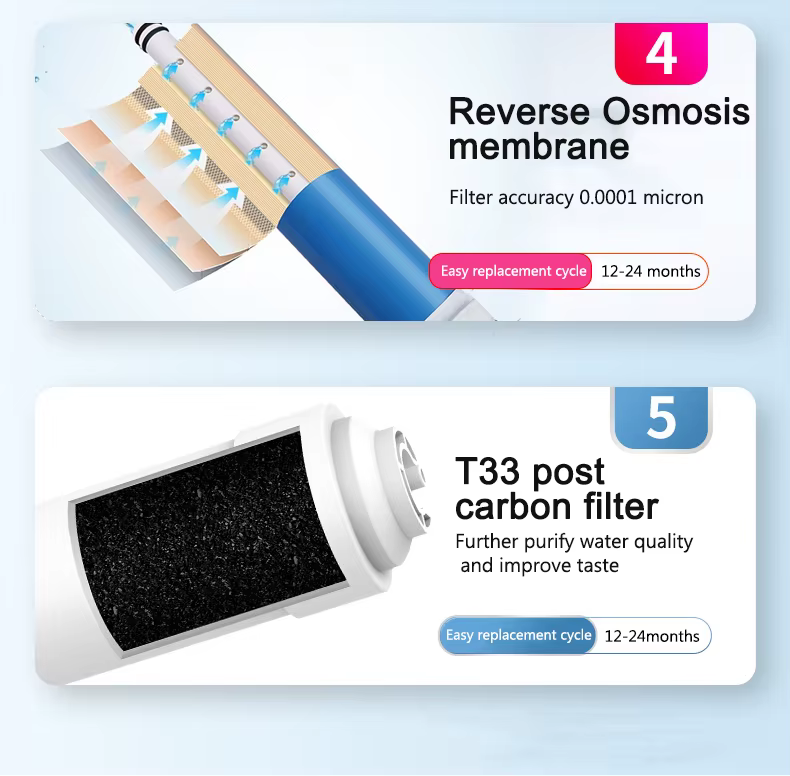 Key features include advanced 5 to 7 stage filtration, UV sterilization for added safety, easy operation and maintenance, eco-friendly materials, compact size for under-sink or countertop use, and app-controlled smart home integration.