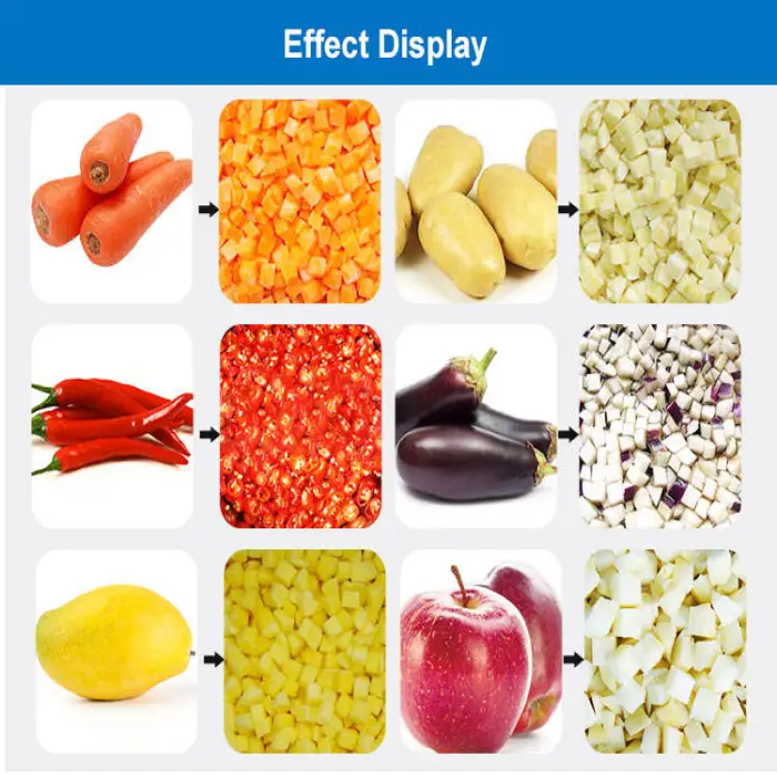 The Vegetable Cube Cutting Machine is designed to cut a variety of fruits and vegetables, including pumpkins and kiwis, making it versatile for different food preparation needs.