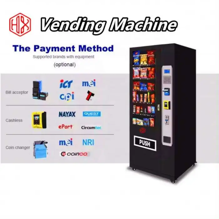 The vending machine accepts multiple payment options including coins, bills, credit cards, and QR codes.