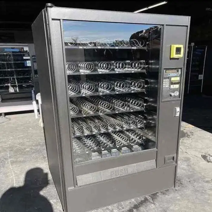 The vending machine is designed to dispense a variety of snacks and drinks, making it perfect for serving foods like chips, candy bars, and beverages such as soda and water.