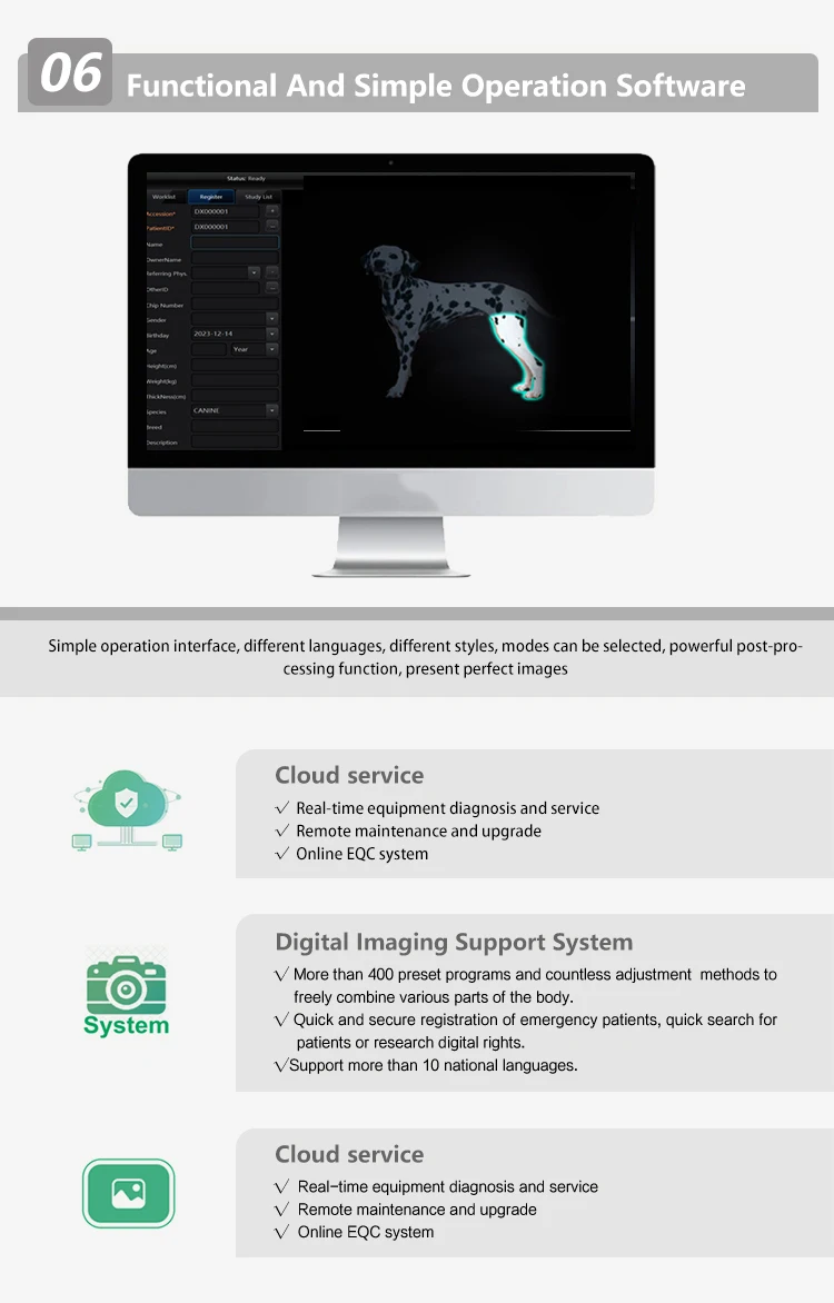 The Vet X-Ray Machine is a specialized imaging device designed for veterinary use, providing high-quality X-ray images to assist in diagnosing medical conditions in animals.