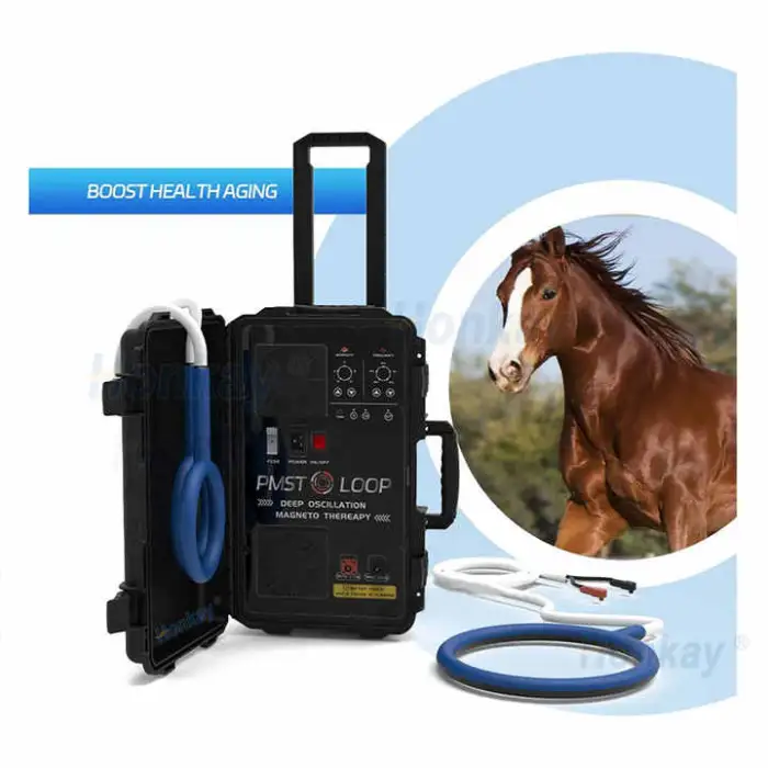 The Veterinary Pemf Equine Machine has a magnetic intensity of 6000 gauss, which is effective for promoting healing and pain relief.