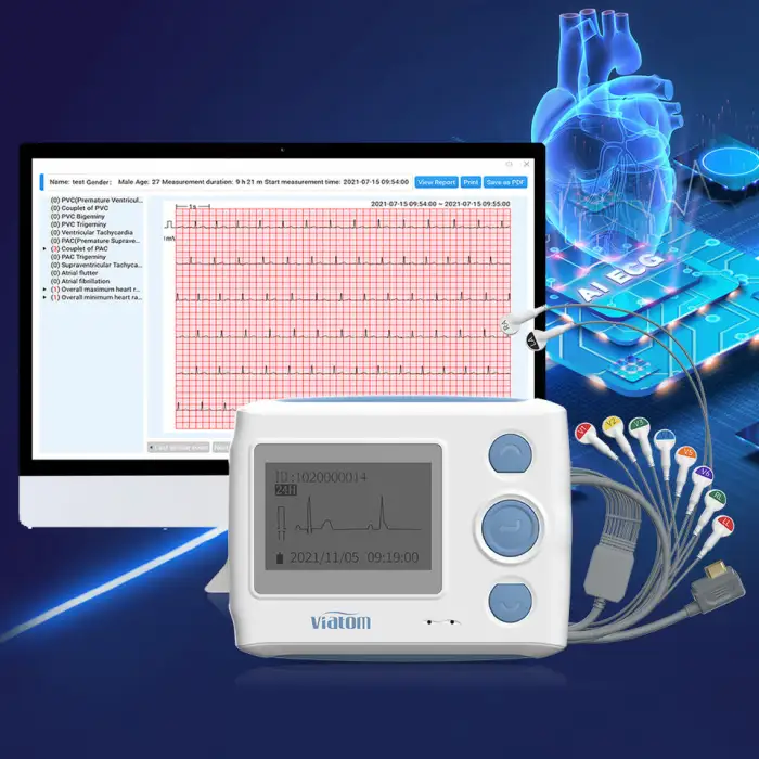 The Viatom TH12 Mini Smart EKG ECG Device is a portable Holter monitor that captures 12-lead ECG recordings, allowing for effective heart health monitoring at home or in a hospital setting.