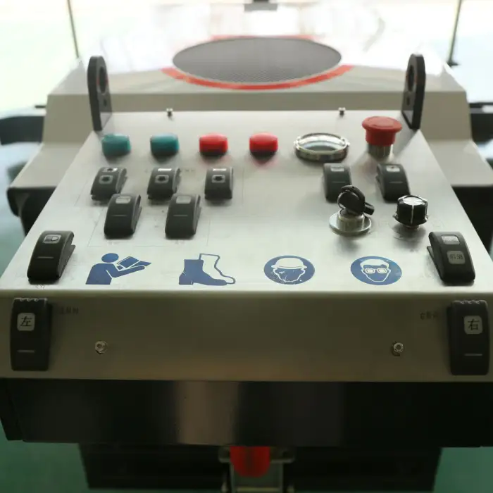 The machine features motor-driven controls and is designed for easy maneuverability, making it user-friendly.