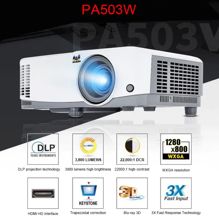 The ViewSonic PA503W uses a lamp-based projection system typical of DLP projectors, ensuring bright and vibrant images.
