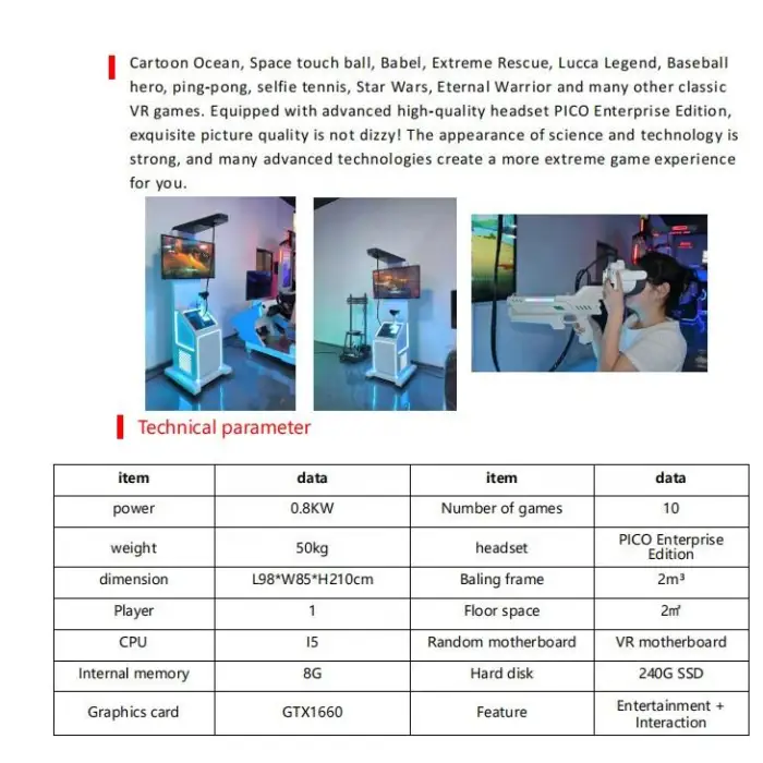 Key features include an exciting VR shooting experience, durable construction, easy operation, and its ability to attract customers.