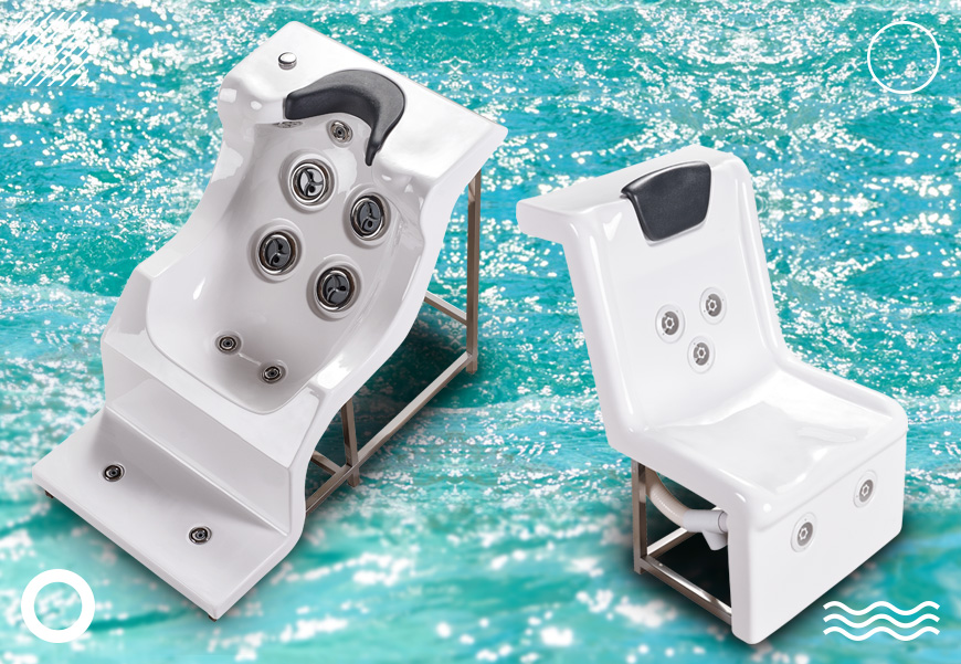 The VTSPA-15 Acrylic Massage Pool Chair is made of acrylic and fiberglass with a stainless steel structure for durability and elegance.