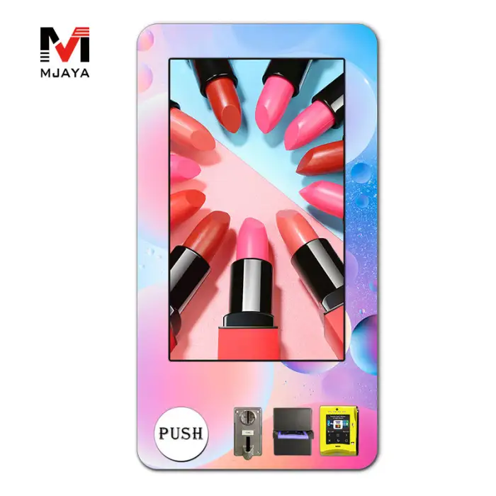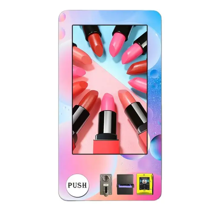 The vending machine dispenses a variety of beauty products, including lipsticks, coffee capsules, and perfume.