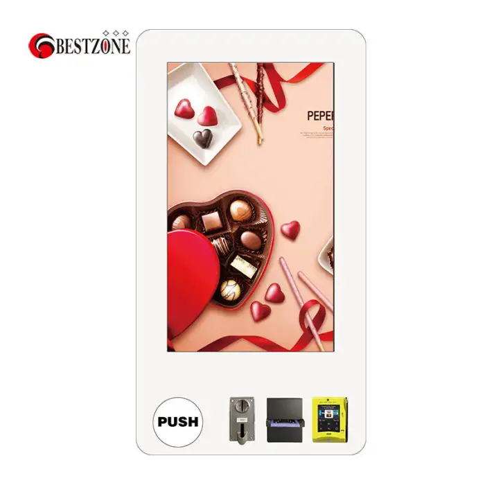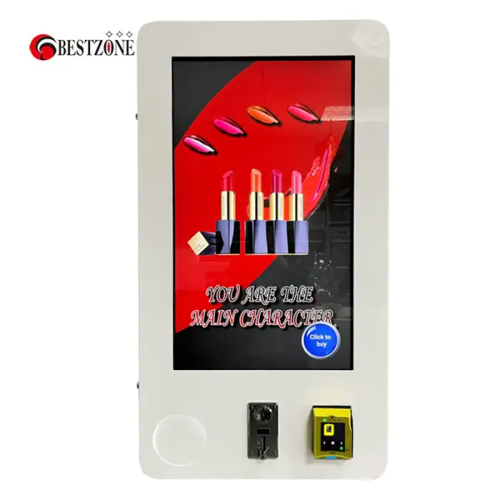 The vending machine features a user-friendly 32-inch touch screen for easy navigation.