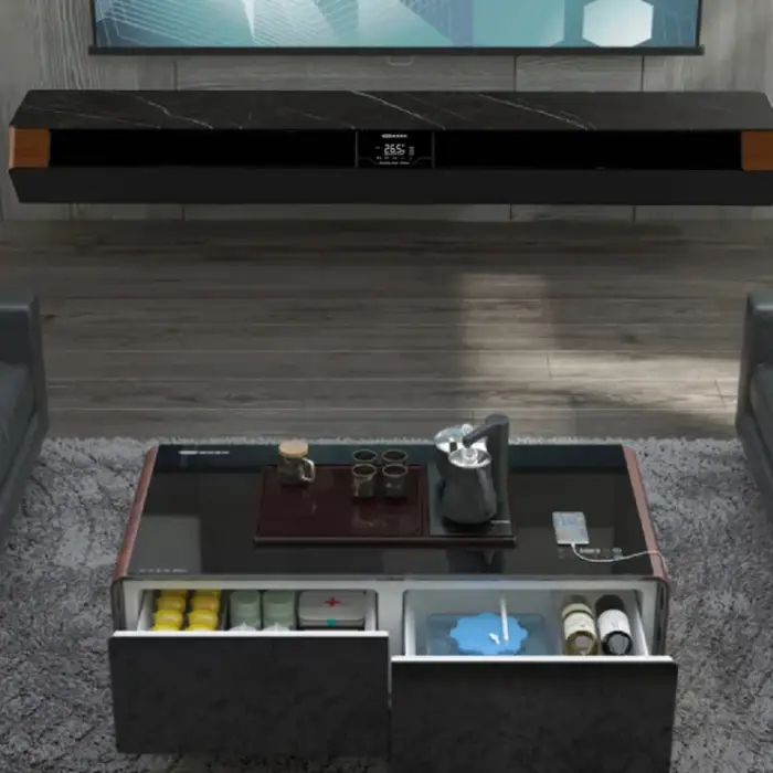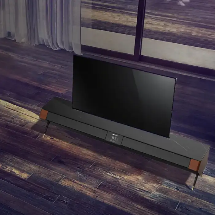 Yes — the model is designed for TV cabinet applications and has a compact profile. However, ensure adequate ventilation for both the TV and the air conditioner and follow manufacturer recommendations for clearance to avoid heat buildup or interference with electronic devices.
