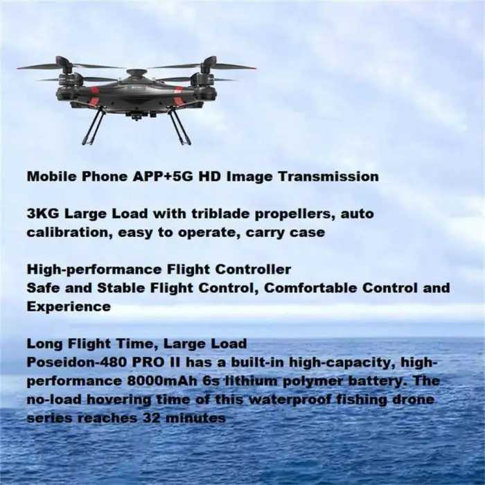 The Waterproof Fishing Drone has a maximum payload capacity of 3 kilograms for bait release.