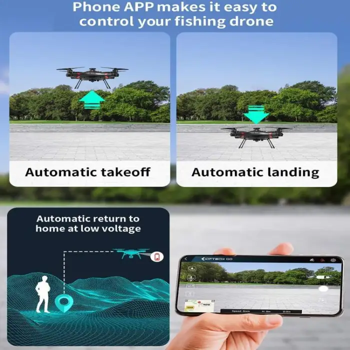 The drone is equipped with a bait release function that allows you to release bait from a distance using remote control.