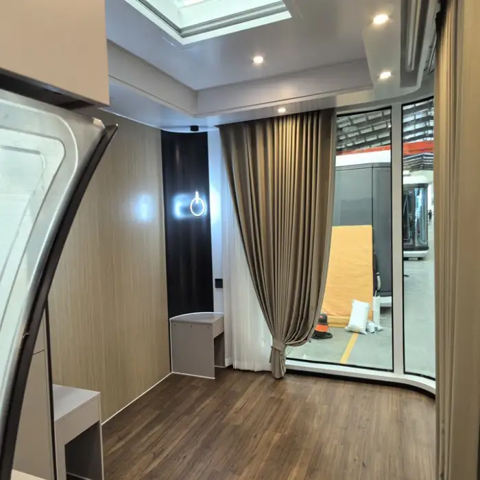 The cabin features 6+12+6 hollow low-e tempered glass windows that are UV resistant.