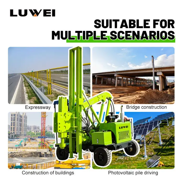 This machine is suitable for installing highway guardrails, setting up road barriers for safety, constructing fence posts along roads, and driving piles in various construction projects.