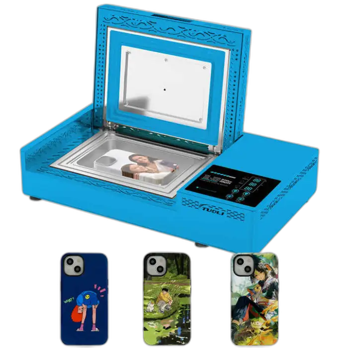 The machine housing is lightweight, durable aluminum alloy. The printed cases should offer shockproof protection (as noted) and the sublimation coating provides long-lasting colors when proper inks and blanks are used.
