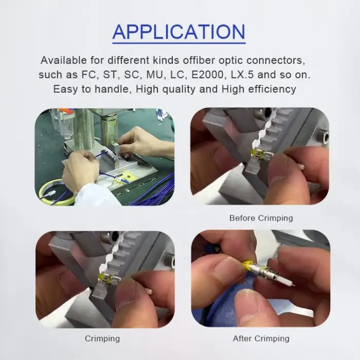 This machine is suitable for fiber optic production lines, telecommunications equipment manufacturing, data center installations, networking projects, and the repair and assembly of fiber optic cables.