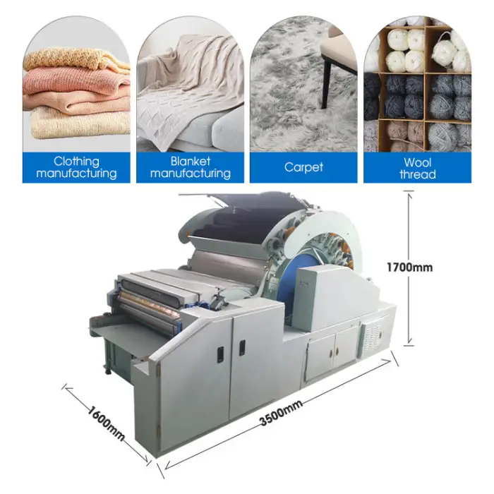 The dimensions of the Wool Carding Machine are 3500mm in length, 1600mm in width, and 1700mm in height.