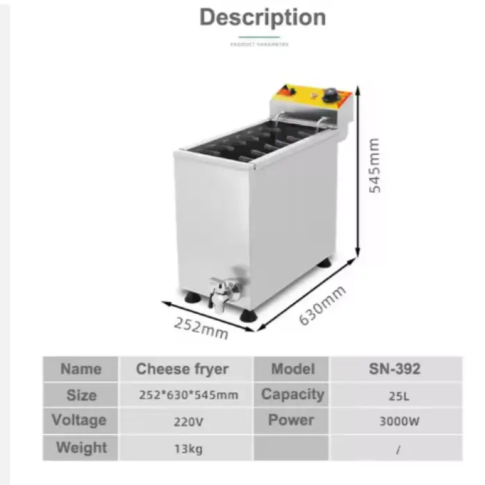 The XEOLEO Commercial Cheese Hot Dog Frying Machine has a generous capacity of 25 liters, allowing you to cook multiple hot dogs or corn dogs at once.