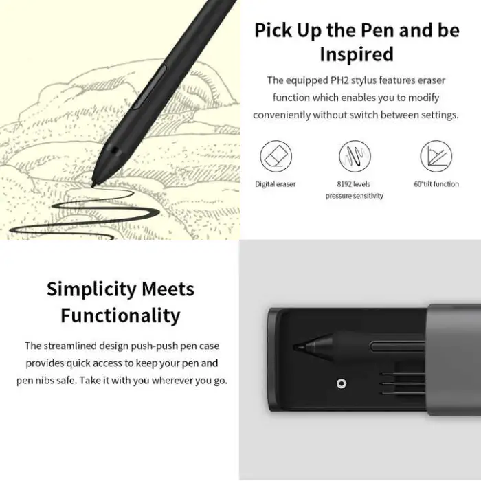 The battery-free stylus supports 8192 levels of pressure sensitivity for precise line weight and opacity control.