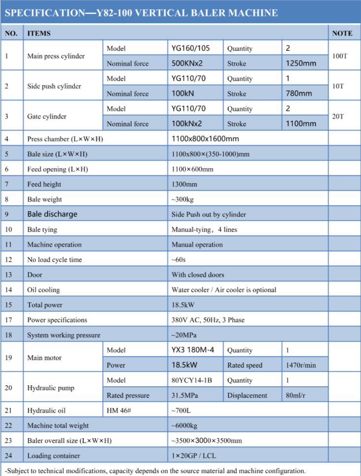 The Y82-100 Vertical Baler machine is powered by an 18.5 kW electric motor.