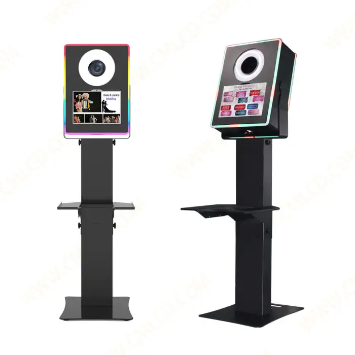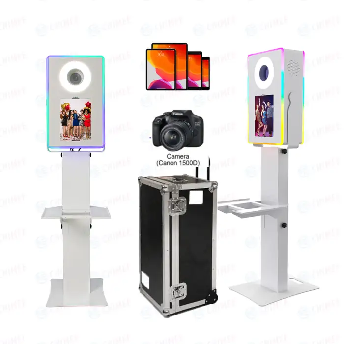 The dual-screen setup features a high-quality DSLR camera for taking photos and an iPad for easy user interaction and viewing.