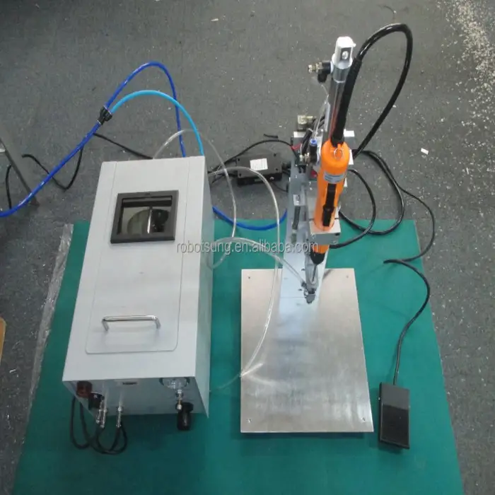 Key features include automatic screw tightening for consistent results, a compact design for desktop use, and reliable pneumatic operation.