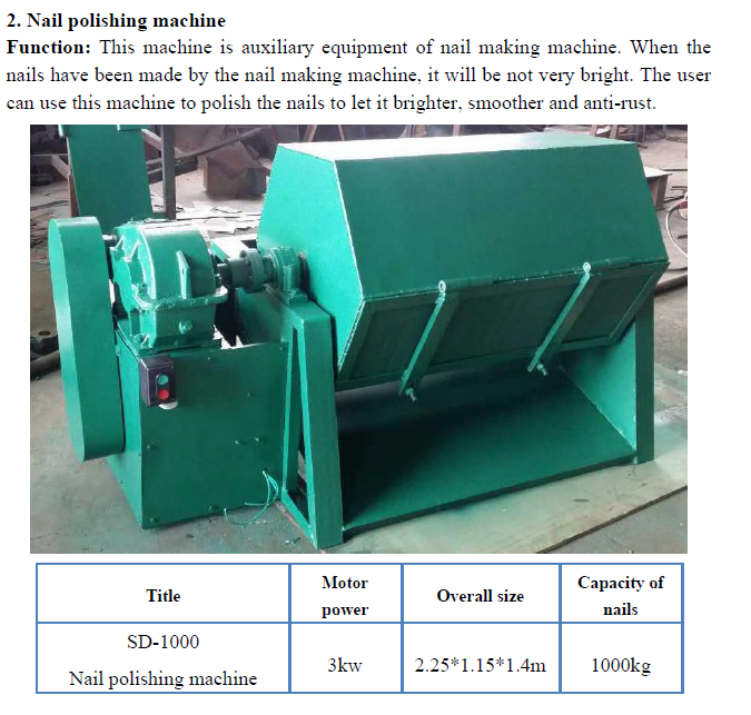 The package includes the Z94-4C nail making machine, the SD-1000 Nail Polishing Machine, and a wire reel. Additional machine parts and fine auxiliaries can also be supplied as needed.