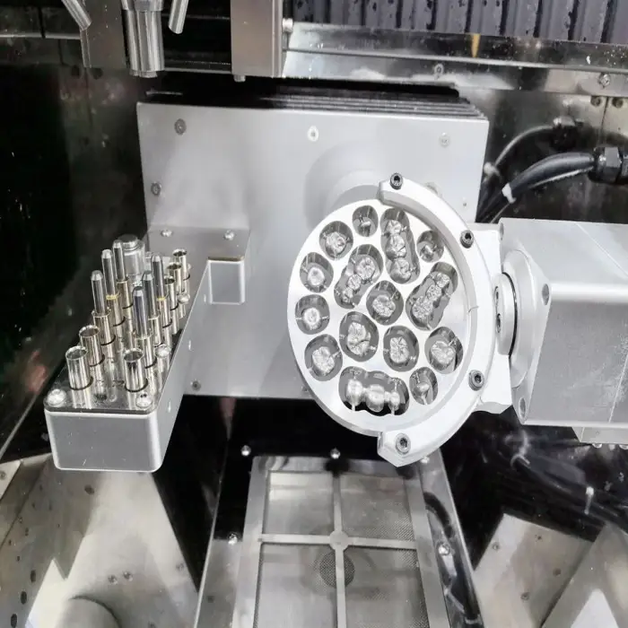 The machine is suitable for creating dental crowns and bridges, fabricating custom dental implants, milling dental prosthetics, and producing dental models and frameworks.