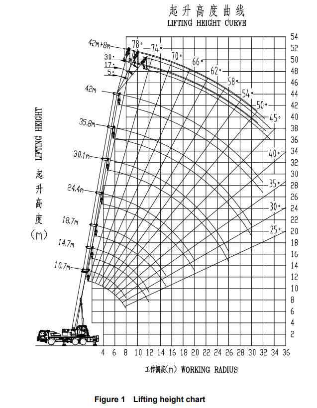 The maximum lifting height is determined by the specific configuration and load conditions, which can be referenced in the lifting height chart provided in the specifications.