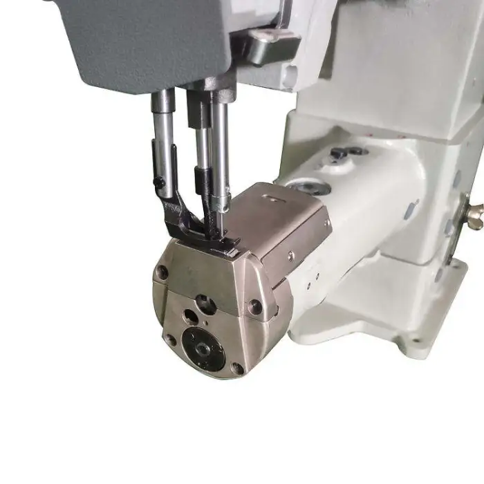 The machine operates using a mechanical feed mechanism, which provides precise control over the stitching process.