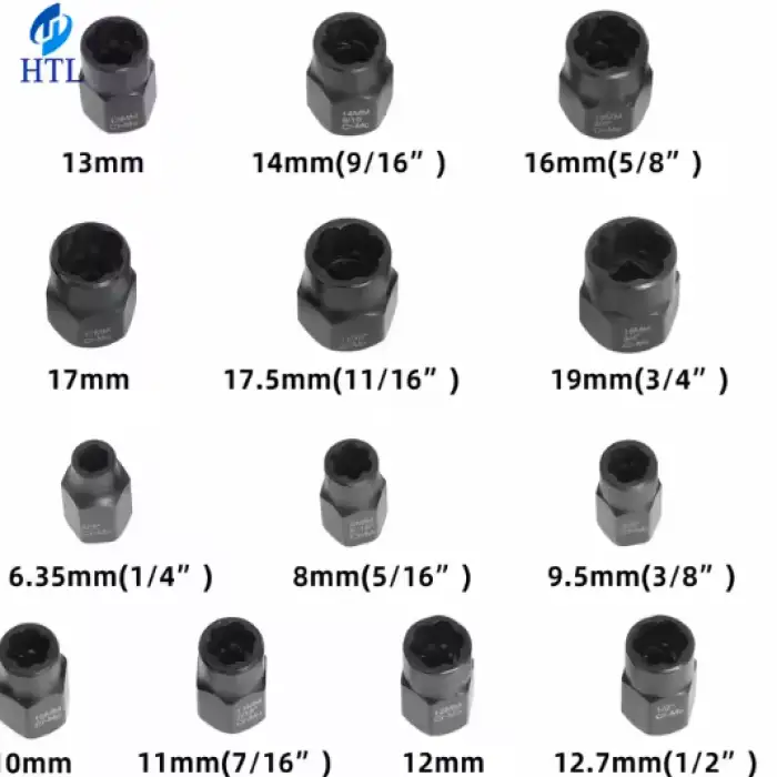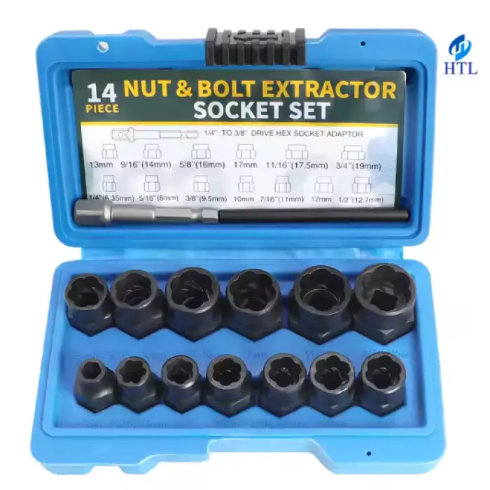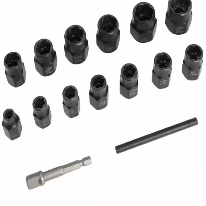The set includes 14 impact screw nut and bolt extractor sockets of various sizes suitable for a range of screws and bolts, along with a 3/8 inch drive bolt remover.