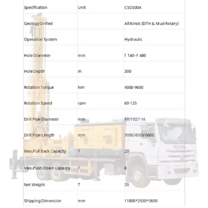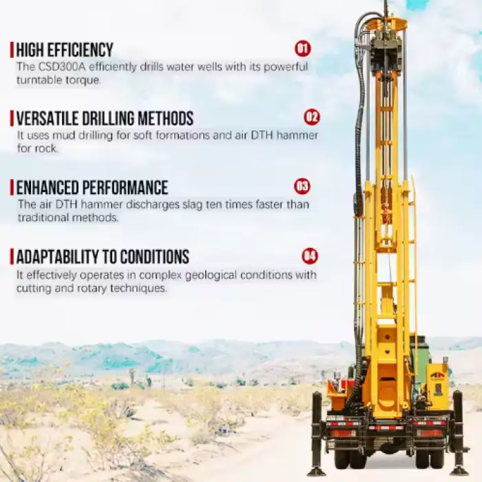 Key features include the ability to drill up to 300 meters deep, hydraulic operation for smooth performance, and a wide drilling diameter.