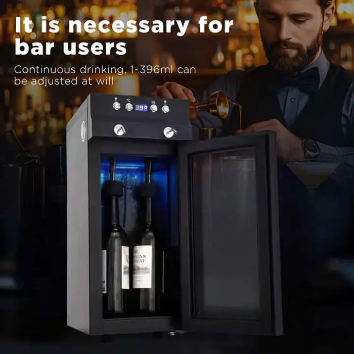 The wine dispenser maintains optimal temperature and uses compressor refrigeration to keep wine fresh.