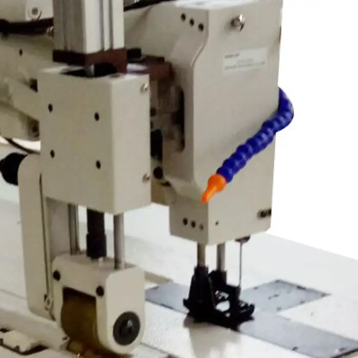 Key features include a large hook for high efficiency, high-speed double needle operation, electronic controls for easy adjustments, and a flat-bed mechanical configuration.