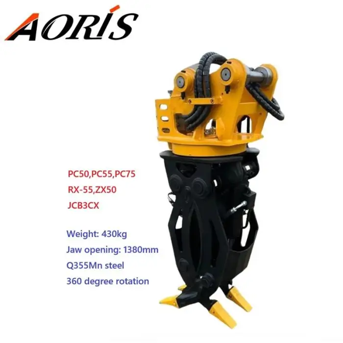 The grapple is designed for excavators ranging from 5 to 50 tons, making it suitable for handling heavy materials like stone, wood, and rock.